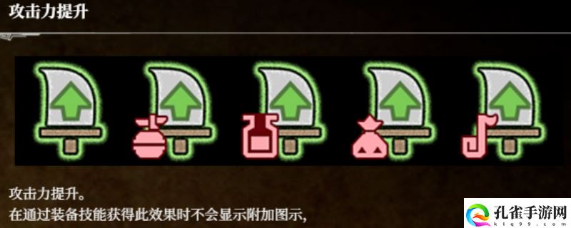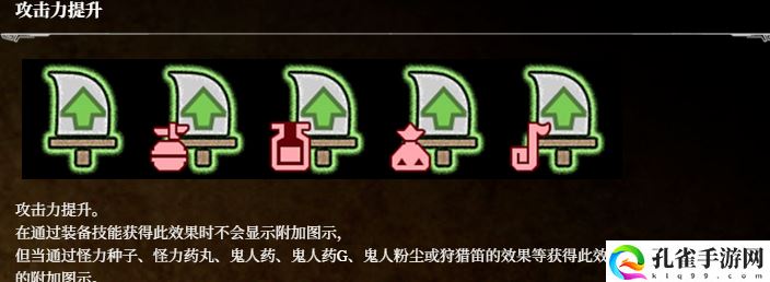 从左往右依次是装备技能,怪力种子(或怪力药丸),鬼人药(或鬼人药大),鬼人粉尘,狩猎笛的攻击力提升。